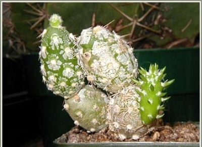 побеги округлые, до 3,5 см в диаметре, с округлыми бугорками; ареолы белые; глохидии светло-коричневые, иногда со щетинкой;