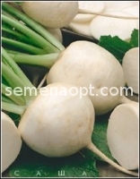 Daikon (sweet radish), established in Japan, where it ranks first among the vegetables sown area . Sasha - early maturing variety, the growing season 35 - 45 days . Usedfresh . root crop round and oval-rounded, up to 10.5 cm, white, smooth . The flesh is white, soft, dense, very juicy . Mass root of 100 to 400 g . The roots are well preserved in for 1 - 2 months .