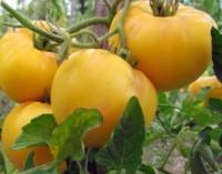 The mid-grade tomato for open field and film greenhouses . From the mass of shoots prior to fruiting are from 110 to 115 days . Indeterminate plant, tall, taller than 2 m, strongly foliated . The first cluster is laid over 9 - 10 sheetfollow - through 3 sheets . The inflorescence is simple with 4 - 5 flowers . Fruits flat round, fleshy, slightly ribbed, multi-chambered, weighing 500 - 700 g or more . In the technical phase of maturity fruit with dark green spots in stalk, and biological - yellow . Due to the increased content of beta-karogina (3.7 - 4.2 mg of 7) fruits are delicious, sweet (contain more than 4% of sugar) and are suitable for children and dietary . Yields in the open field at formirovki one stem at a plant density 4 plants per square meter . Metro - 12 - 15 kg . The variety is resistant to a range of diseases: TMV, Lycopersicum virus-5, bacterial blight, Alternaria .