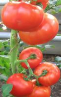 Early - from germination to fruiting 90 - 95 days . The plant is determinant, a height of 60 - 70 cm strongly foliated . The first cluster is laid on 6 - 7 sheets, brush 5 - 6 fetuses with crank articulation . The fruits are round with pointed apex, dark red, very dense,fleshy, weighing 140 - 150 g . Resistant to TMV, black bacterial spot, Alternaria and Fusarium . Taste very high quality, portability and storage ability of red fruits are excellent . Yields in open ground over kg and of film teplitsah- 15 kg / sq. m . The value of the hybrid: earliness, large-fruited, highproductivity, good taste, transportability, complex disease resistance . Distinctive features of a hybrid - dark red fruit, very firm with pointed apex .