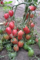 Small-fruited, mid, determinate, for greenhouses . Cort multi-purpose . plant up to 1 . 5 m with beautiful branched inflorescences, 20 - 50th uprightsmooth purple-pink egg-shaped fruits, weighing 25 - 30 g . Yields 4 - 5 kg / plant . To grow one stem with removal of excess shoots and garter to the support . Recommended for greenhouses and shelters, can be successfully grown on balconies and loggias .