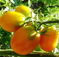 Late-cultivar is medium . Plants powerful, vigorous, highly-branched, indeterminate . Brush simple, drooping, with 8 - 10 fruits . Yield - up to 3 - 4 kg from one plants . After shoots appeared, the approximate period of maturation occurs at day 120 . This variety is recommended to grow in greenhouses . Cangrow up to 2 m in height . Fruit oval, yellow . The weight of the fetus can be up to 90 g . Great for fresh consumption and for canning. Good transportability and keeping quality. Agrotechnics : Tomatoes are best grown through seedlings . A good time to do so from late March to early April . Planting depth to 3cm . Before planting seedlings, seeds should be treated with a solution of potassium permanganate, and then rinse with water . In the greenhouse seedlings planted in May, at the age of 60 - 65 days . As the form of the stem in two, making removal Trunk cleaner . Scheme planting 70 x 40 cm . Care is regular watering with warm water . Tall tomatoesnecessarily need to be tied up and remove the lower stepchildren! For tomato suitable not heavy, highly fertile soils .